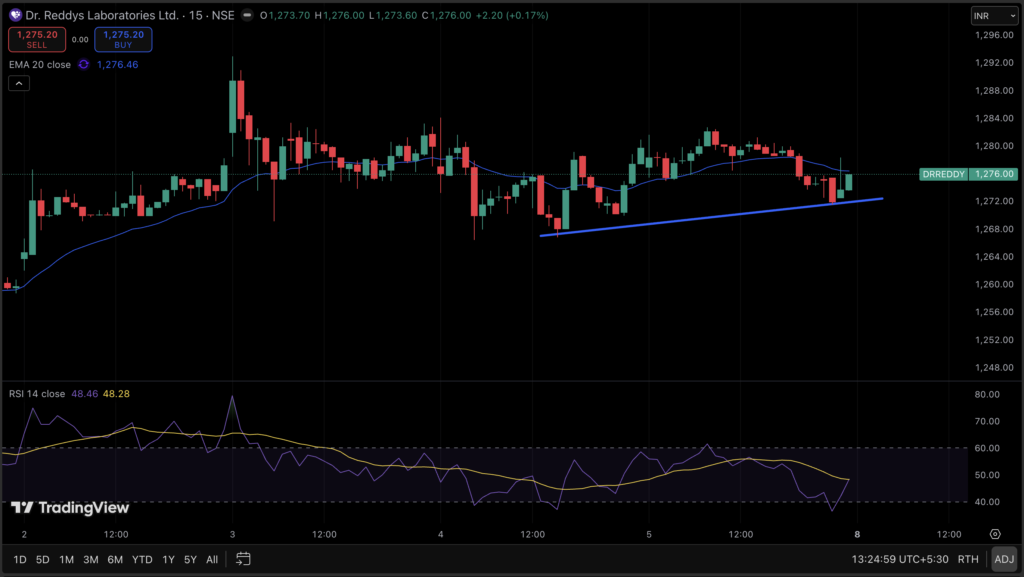 Dr. Reddy’s Laboratories (CMP ₹1,276) looks set for an upmove toward ₹1,320 and ₹1,350, supported by strong technical and fundamental factors. Technically, the RSI is above 50, indicating rising bullish momentum. The stock has also given a clean 20-EMA breakout, signalling a positive trend shift. Price action shows strong support at lower levels, and healthy trading volumes further validate buyer strength. Fundamentally, the company maintains stable earnings, strong margins, and a solid product pipeline across key global markets. Its consistent growth and financial stability support the likelihood of continued upward movement toward the projected targets.