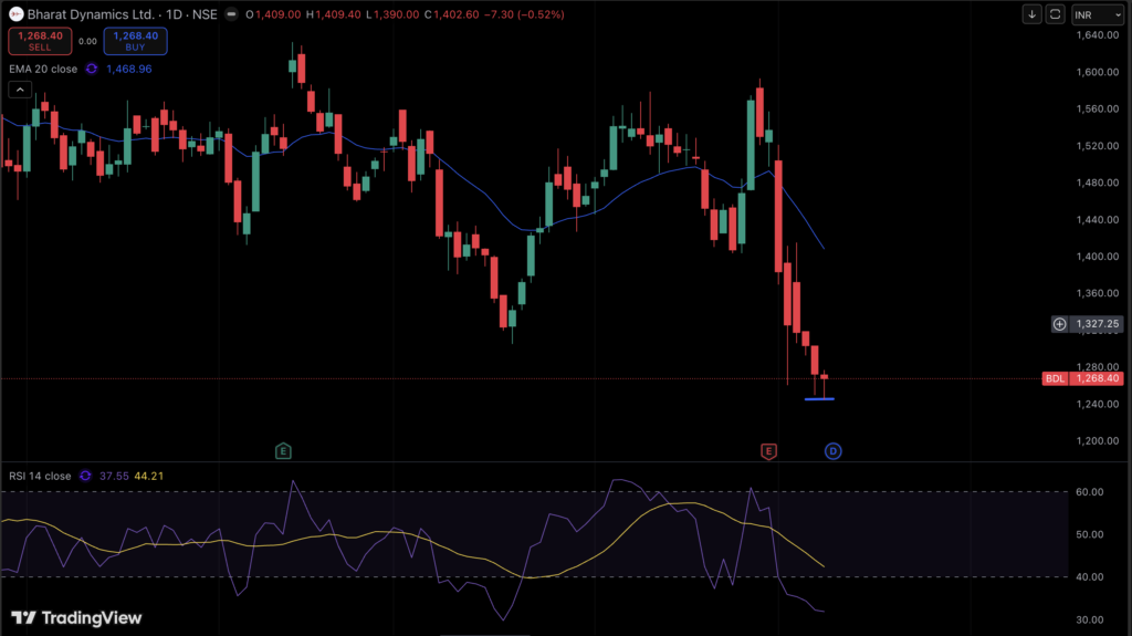 BDL (CMP ₹1,268) appears poised for an upward move toward ₹1,320 and ₹1,400, backed by solid technical and fundamental strength. Technically, the RSI suggests the stock is emerging from oversold territory. It has also delivered a clear 20-EMA breakout, indicating a positive trend reversal. Price action reflects strong support at lower levels, while healthy volumes confirm buying interest. Fundamentally, the company shows stable earnings, robust margins, and a strong product pipeline across key global markets. Consistent growth and financial stability reinforce the probability of further upside toward the stated targets.